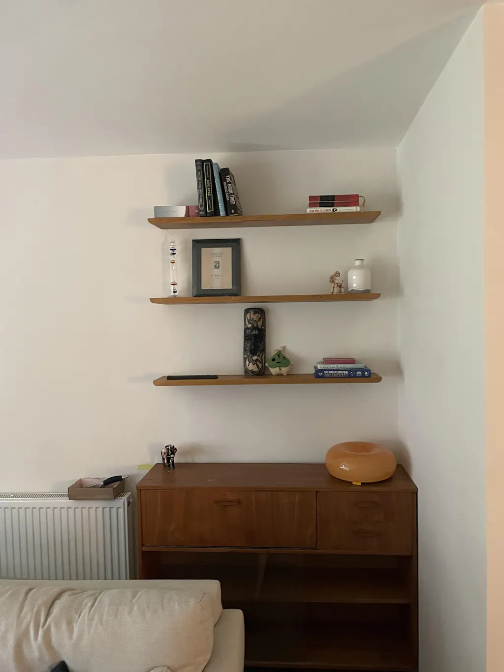 Its slim profile and smooth lines create a light visual effect, offering the perfect surface to display your books, decorations, or special items. This shelf almost seems to float on the wall, adding a sense of lightness that fits into both contemporary and eclectic environments.