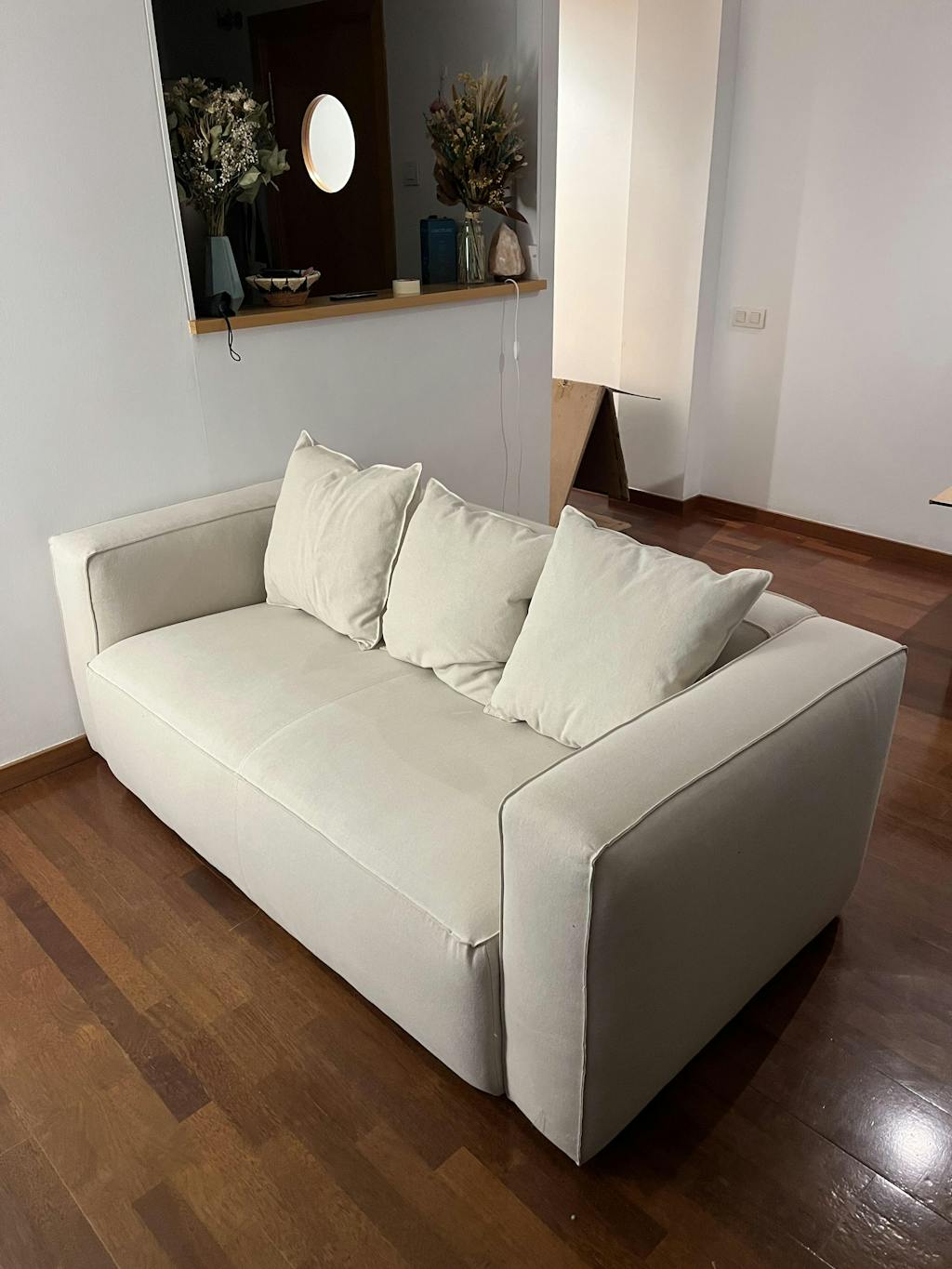 A treat to the eye and pleasant to the touch, both thanks to the natural materials used in the construction of this sofa. Sits comfortably: not too stiff but luckily not saggy either. Exactly what we were looking for, thanks Hannun!