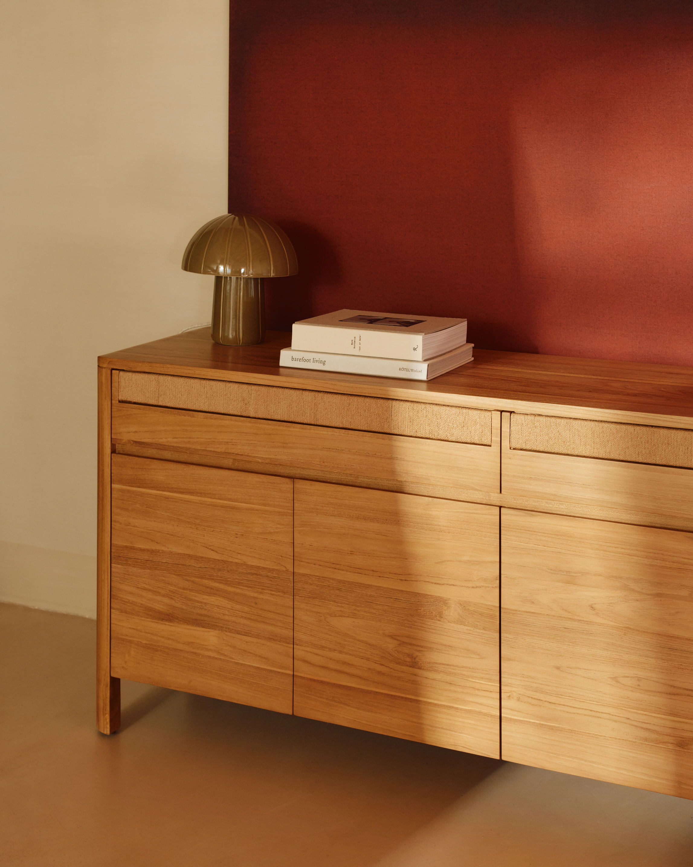 Progettata per chi cerca equilibrio tra funzionalità e calore, la madia Neo diventa il punto di serenità di qualsiasi ambiente. La sua silhouette pulita e i bordi dolcemente arrotondati evocano un’estetica naturale e senza tempo, mentre la combinazione di legno massello di teak e dettagli in corda intrecciata aggiunge texture e autenticità al design.