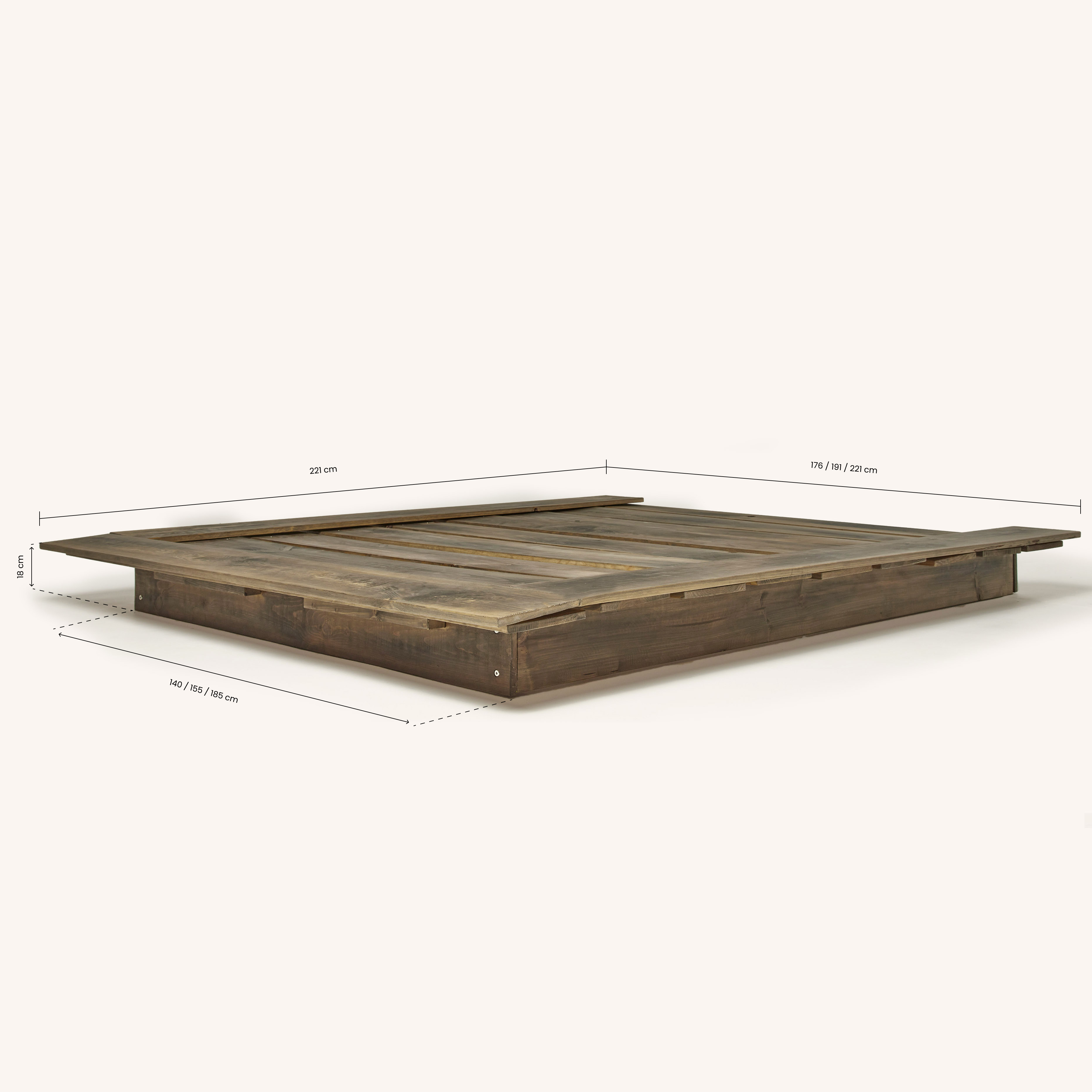 El tatami doble Anhelí nace a partir de madera de pino recuperada, dando una segunda vida a este material y reafirmando nuestros valores. Este proceso celebra la belleza de la madera recuperada, lo que hace que cada pieza sea única y auténtica. Las pequeñas variaciones en el acabado son prueba de su carácter especial y del proceso artesanal que la define.